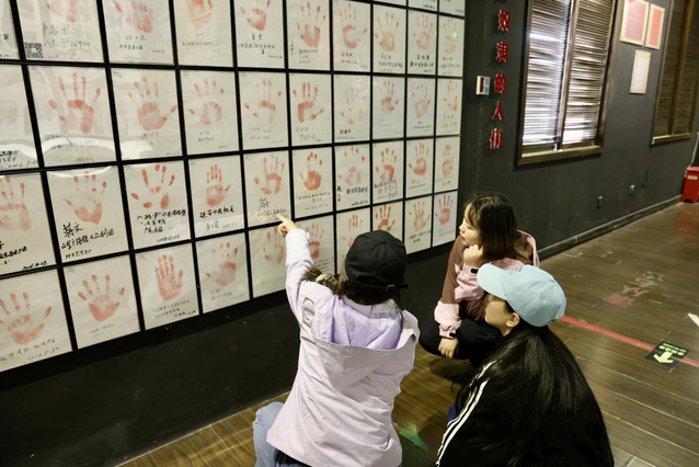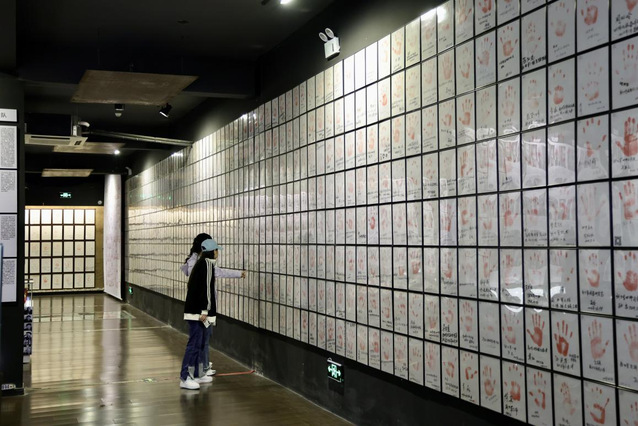 研学接近尾声时,师生围在“民间英雄印记展区”,一面布满红色手印的展墙格外震撼!每一枚手印旁都标注着抗战民间志士的姓名与事迹,红黑交织的印记如同一部平民抗战的鲜活史诗。曹婷婷老师指着一枚标注“1938年参与地下物资运送”的手印说道:“这些手印是民间英雄的‘生命印记’,他们以平凡之躯在乱世中书写抗争。这种‘平凡亦坚守’的精神,正是我们作为党员发展对象要传承的底色,未来要在学习工作的点滴中,烙下属于自己的担当印记。”