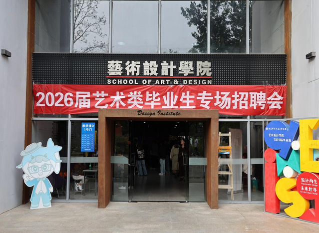 招聘会现场,艺术设计学院门口“2026 届艺术类毕业生专场招聘会” 的红色横幅格外醒目,充满艺术感的学院建筑与各类企业招聘展位交相辉映,营造出浓厚的艺术就业氛围。会场内,不同领域的企业展位如艺术展区般错落分布,涵盖文化传媒、艺术设计、数字媒体等多个领域。