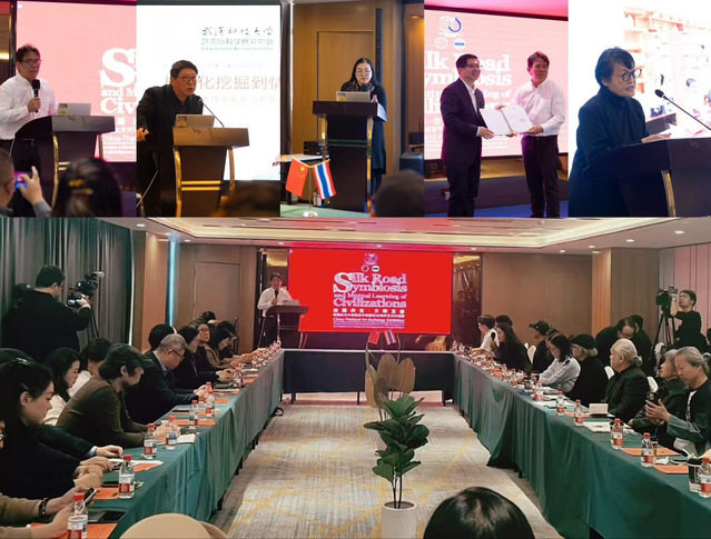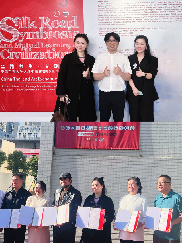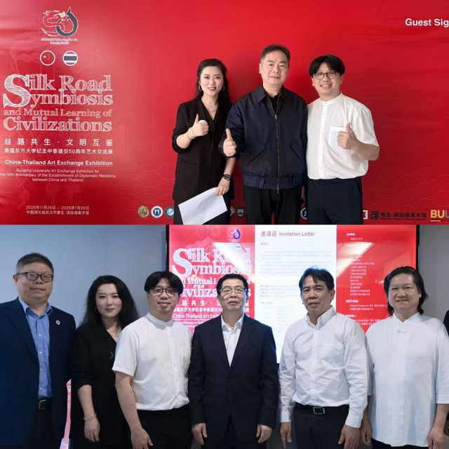 2025年11月29日,为纪念中泰建交50周年,由泰国东方大学主办,湖北美院、武汉科技大学、南宁师范大学、景德镇学院、浙江传媒学院、南京审计大学金审学院等多家中方院校协办的【丝路共生·文明互鉴】中泰艺术交流展在中国武汉普生汤逊湖美术馆隆重开幕。本次展览汇聚了中泰两国120件艺术作品、140余名艺术家及专家代表莅临现场,活动受到泰国政府高度重视,泰王国驻华大使韩灿才先生以视频形式发表致辞,他指出,本次展览不仅是两国艺术交流的盛会,更是泰中友好关系在人文领域的重要体现,对推动两国高校合作与民间交往具有重要意义。