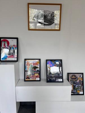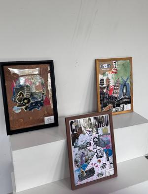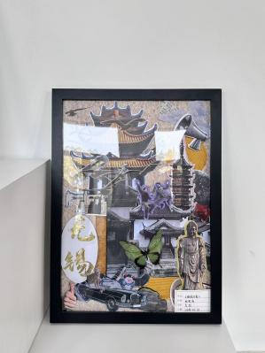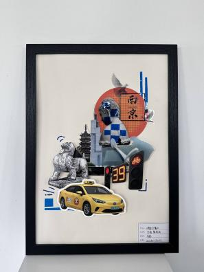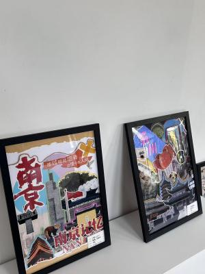 拼贴万象。一幅幅充满创意的拼贴作品早已跃然眼前,成为布展现场最动人的风景。从《南京南站》里复古旗袍女子与现代都市剪影的交织,到《南京印象》中黄色出租车、六朝石刻与紫峰大厦的碰撞;从《南京记忆》里明城墙砖、中山陵雪松与红色旗帜的呼应,到《苏·韵》中苏州园林、虎丘塔与东方之门的融合——每一幅作品都以拼贴为媒介,将城市地标、历史印记、市井烟火与当代生活巧妙缝合,用碎片化的视觉语言,诉说着同学们对不同城市的独特观察与情感联结。 这些作品里,有老门东的飞檐翘角,有鸡鸣寺的白鸽翩跹,有平江路的粉墙黛瓦,也有恐龙园的童趣剪影。它们既是对城市文化的致敬,也是青年一代艺术表达的鲜活注脚,让观众在方寸之间,便能触摸到不同城市的肌理与温度。