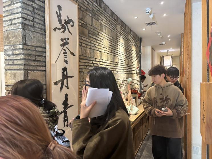 《室内陈设设计》课程由企业外聘导师、行业资深设计师林旭东领衔。林老师带领学生团队走进云几·浮生六记店,聚焦空间美学与氛围营造。在调研现场,林老师引导学生从材质肌理、光影层次、茶文化与家具搭配等角度,对茶馆的包厢与开放式卡座区进行了详细测绘与记录。他强调:“陈设不仅是视觉装饰,更是空间情绪的表达,云几的‘浮生六记’主题空间本身就是一本立体的教科书,同学们要读懂其中的文化叙事。”